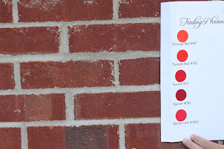In order to provide a bit of variety in my example, I also held our colors next to a brick wall. You can see here that the closest "brick" color that we offer is garnet since it is our deepest red. The true brightness and almost "pink" tint to our Dahlia red can really be viewed in this photo.