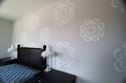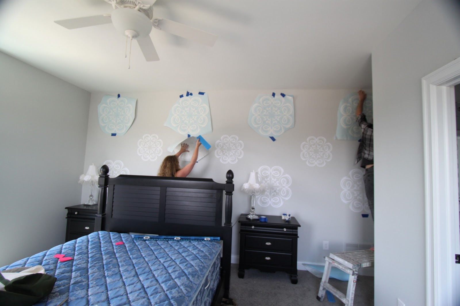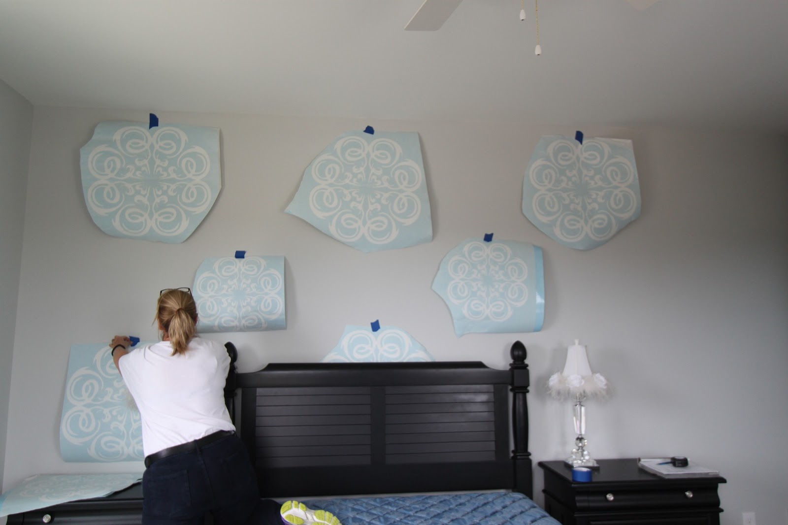 Here you see the guest room. We used these funky circles in 25" and 18" diameters. Because we didn't have the perfect measurements for the room before we started, it was a bit of a guessing game and then a LOT of math when we got there! I'm not excellent at math...thank goodness Nick and Michael came along! We taped up all of the designs to get an idea of how it would look after we were done and then measured out from the ceiling and left wall to get them all spaced perfectly and lined up just right. We also used a level from the center of the design to make sure that they all looked the same. It took us about 45 minutes from start to finish.