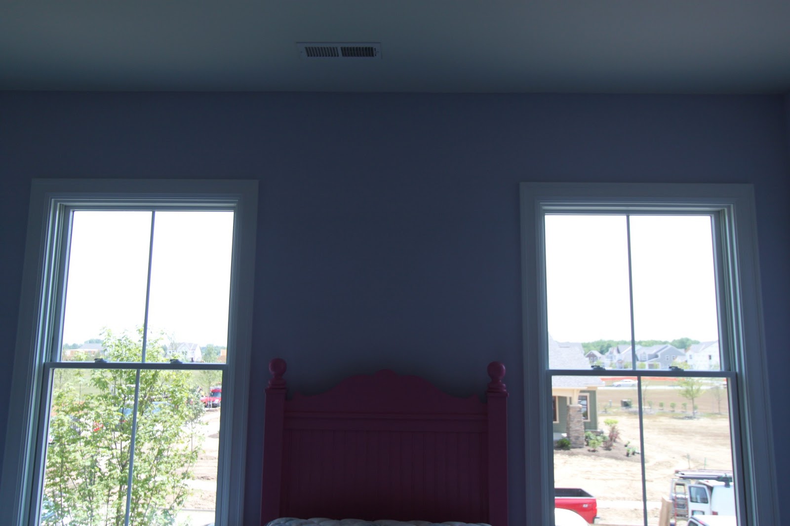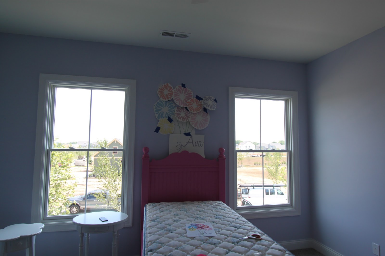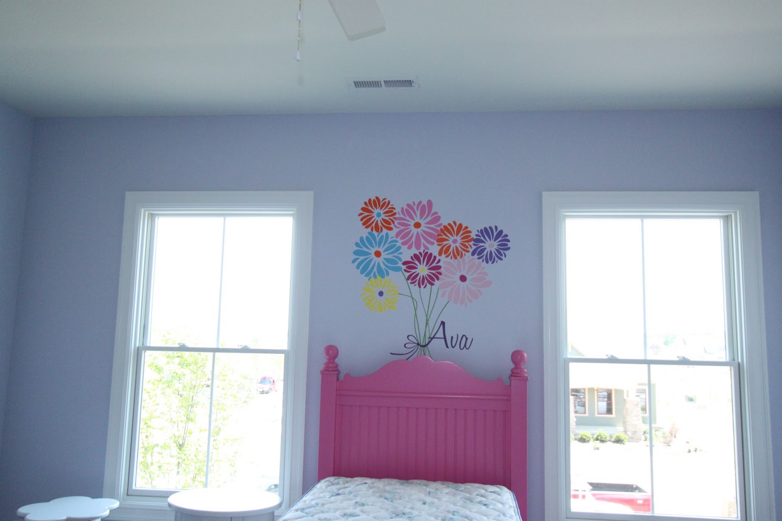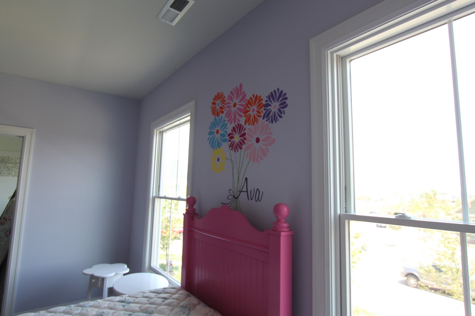 We used decals in another room in the house, which was the little girl's room. As this is a model home, the name in the design is actually that of the builder's daughter- a small detail that warmed her heart. We used a lot of different colors in this design, and while the photos don't do it justice, it looked really beautiful on the lavender walls. Installation on this one only took us about 10 minutes, and that was only because we had to space out the flowers just right.